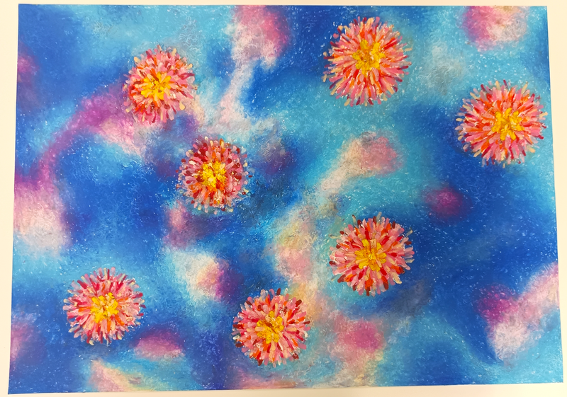 gestes sont rapides et marqués. Le résultat est intense visuellement avec les couleurs vives. Le contraste avec le fond blanc